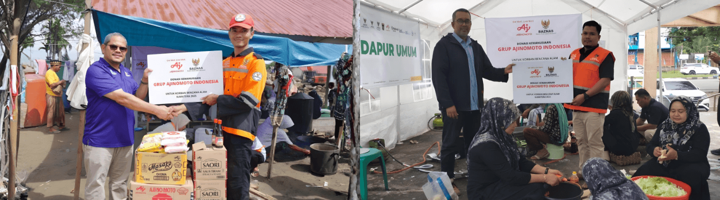 Melalui kolaborasi dengan Badan Amil Zakat Nasional (BAZNAS), Ajinomoto menyalurkan produk Masako®, SAORI®, AJI-NO-MOTO® MSG, serta donasi dana untuk pengadaan bahan pangan di dapur umum yang melayani pengungsi di Meureudu - Aceh, Koto Tengah - Padang, dan Angkola Selatan – Sumatera Utara. Dapur umum ini memastikan para pengungsi tetap mendapatkan makanan yang aman dan layak selama masa pemulihan. Bantuan diserahkan langsung oleh para Regional Sales Manager PT Ajinomoto Sales Indonesia di daerah terdampak bencana kepada tim BAZNAS Tanggap Bencana (BTB) untuk kemudian didistribusikan kepada masyarakat di lokasi terdampak.