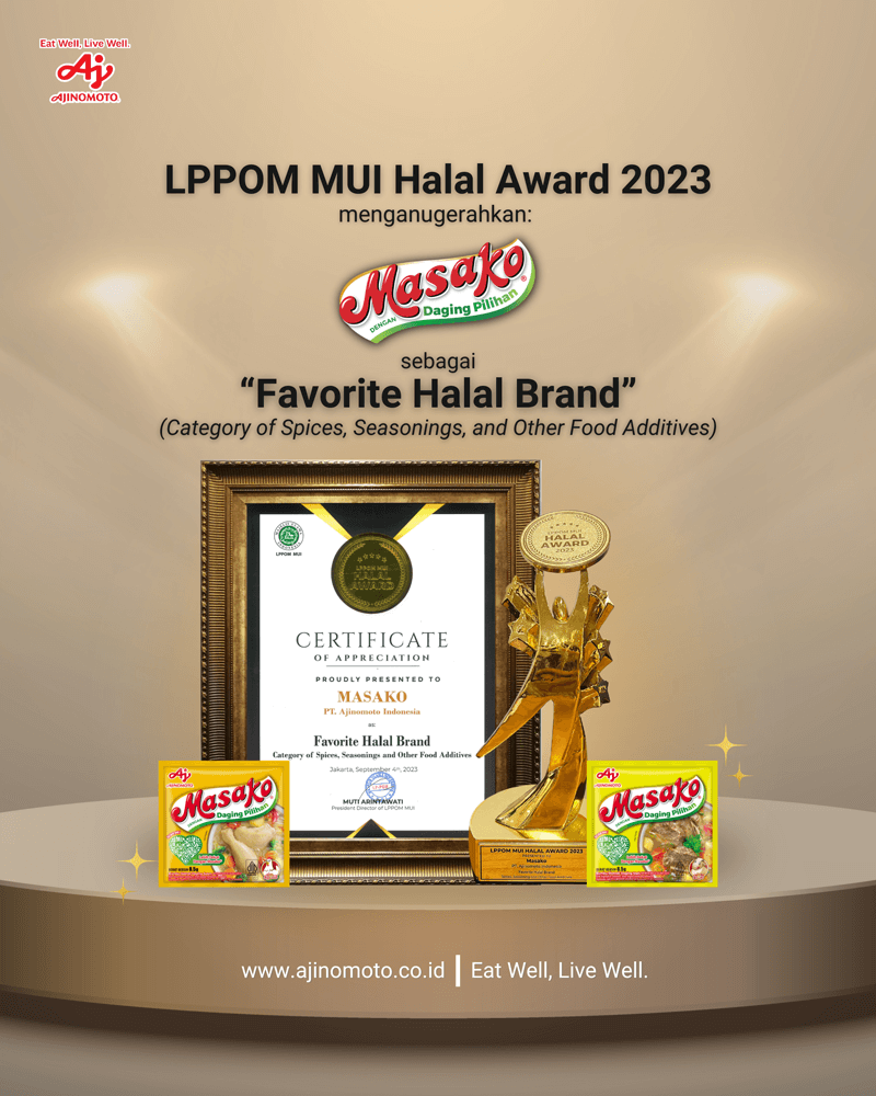 PT AJINOMOTO INDONESIA (Ajinomoto) secara konsisten memastikan seluruh lini produknya untuk mendapatkan sertifikasi halal. Tidak hanya itu, Ajinomoto juga konsisten menerapkan Sistem Jaminan Halal (SJH) di seluruh pabriknya dalam melakukan proses produksi. Dengan komitmen dan konsistensi tersebut, salah satu brand milik PT Ajinomoto Indonesia - Masako® mendapatkan penghargaan Favorite Halal Brand (Kategori: Bumbu, Perisa, dan Bahan Tambahan Pangan) dalam Halal Award 2023 yang diselenggarakan oleh LPPOM MUI.